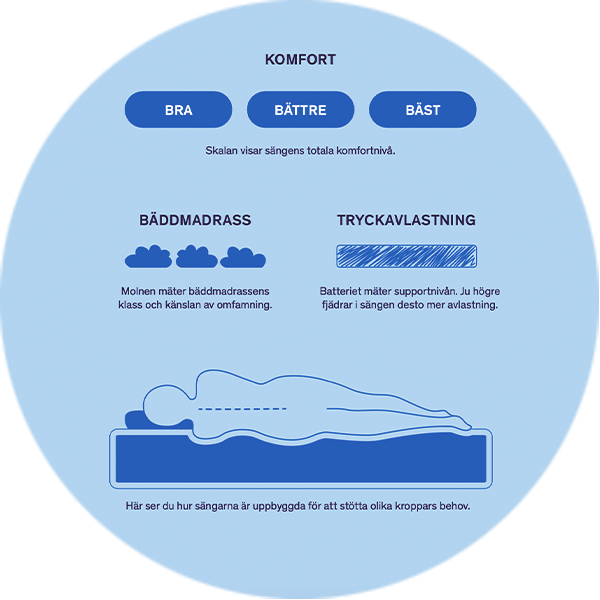 Vi gör det enkelt att välja rätt och svårt att välja fel. Vår komfortguide gör det enkelt att se skillnaderna mellan sängarna. Sängarna graderas utifrån komfortnivå, bäddmadrass och tryckavlastning.