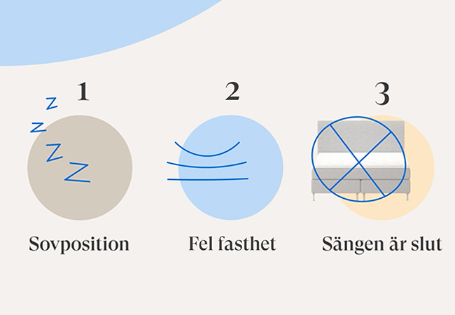 Din sovställning kan vara en indikator på att det är dags att byta säng. Om du sover på mage och drar upp benet kan det tyda på att din säng inte ger dig den avlastning du behöver. Vänder och vrider du på dig hela natten utan att hitta en skön position kan även det vara ett tecken på att din säng inte är bra för dig.