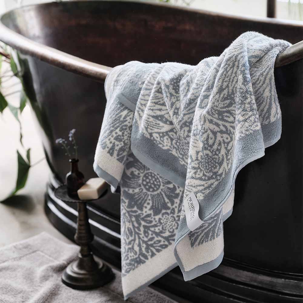 Morris & Co. och Mille Notti har tillsammans skapat handdukar i lyxigt mjuk och fluffig ekologisk ringspunnen bomullsfrotté. Dessa handdukar är jacquardvävda med det vackra Marigold-blommönstret av William Morris från 1875 och är certifierade av GOTS. Den är härligt tjock med en utmärkt absorptionsförmåga samt uppfyller kraven för STANDARD 100 by OEKO-TEX.
