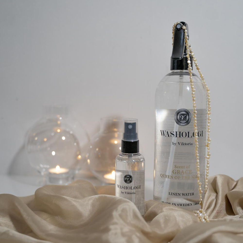 Washologi Grace Linnevatten har en mild doft av stor bladkaktus. Fräscha upp dina textilier med linnevatten från Washologi. Många gånger räcker det att vädra textilier för att det ska bli fräscht igen. En nytvättad känsla får du genom att spraya dina textilier med denna produkt. Linnevattnet minskar även statisk elektricitet och fungerar på alla material, tänk på att spraya en bit ifrån på sidenmaterial, det kan bli vattenfläckar. Kan användas efter strykning och när du ångat dina textilier.