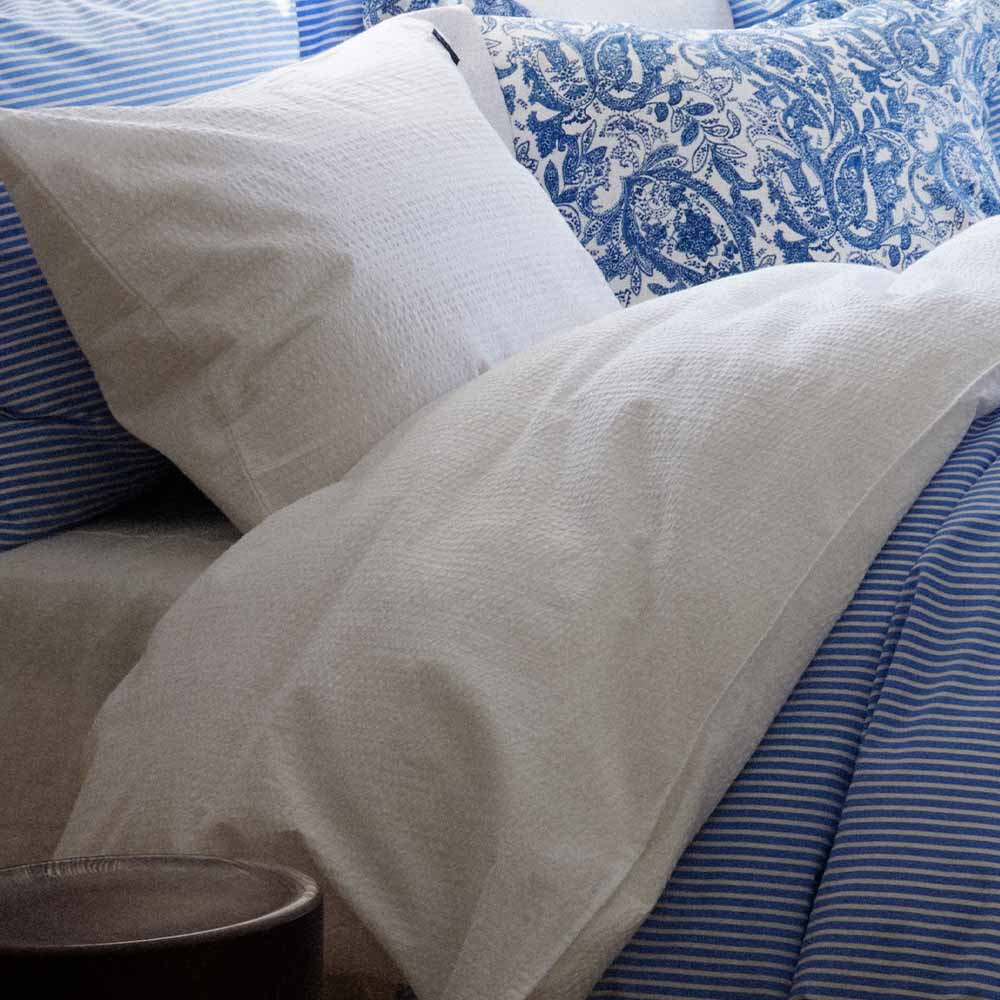 Seersucker örngott från Gant är tillverkat i 100% bomull. Den luftiga och härliga känslan är mycket tack vare att sömnadstekniken bäckebölja har används. Det finns även matchande påslakan