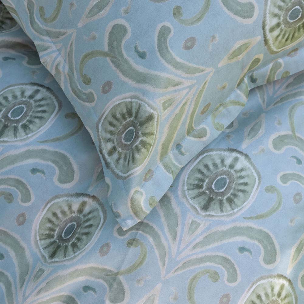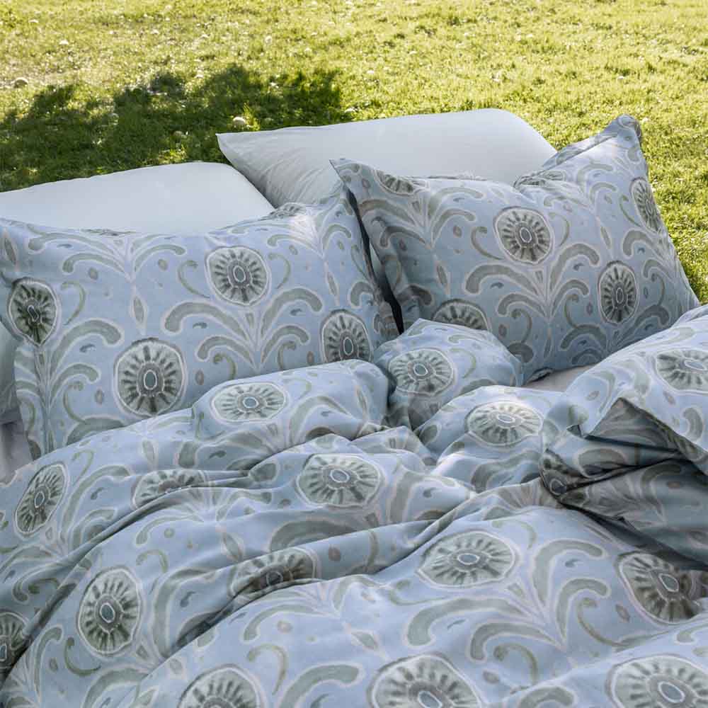 Borås Cotton Moulins Påslakanset i 100 % bomullssatäng har en ljusblå bottenfärg och ett mönster inspirerat av traditionell marockansk design i gröna, beige och bruna nyanser. Om du vill ge ditt sovrum ett kreativt och unikt intryck är detta det perfekta påslakansetet för dig.