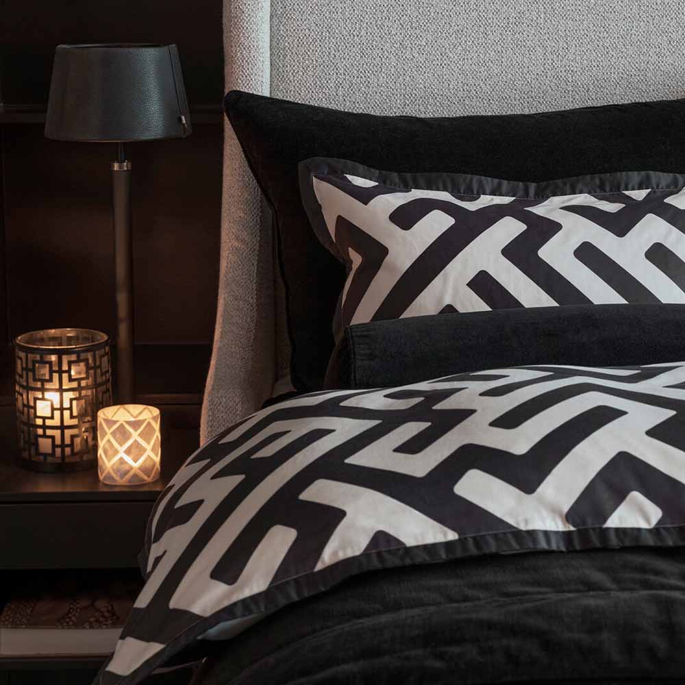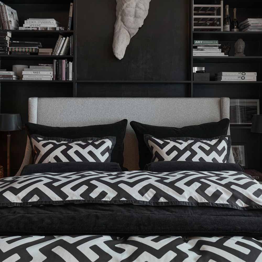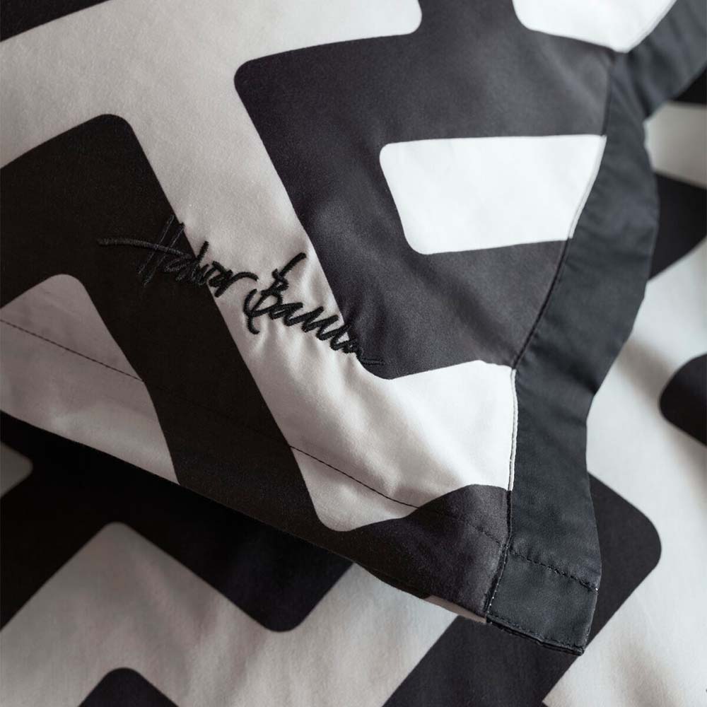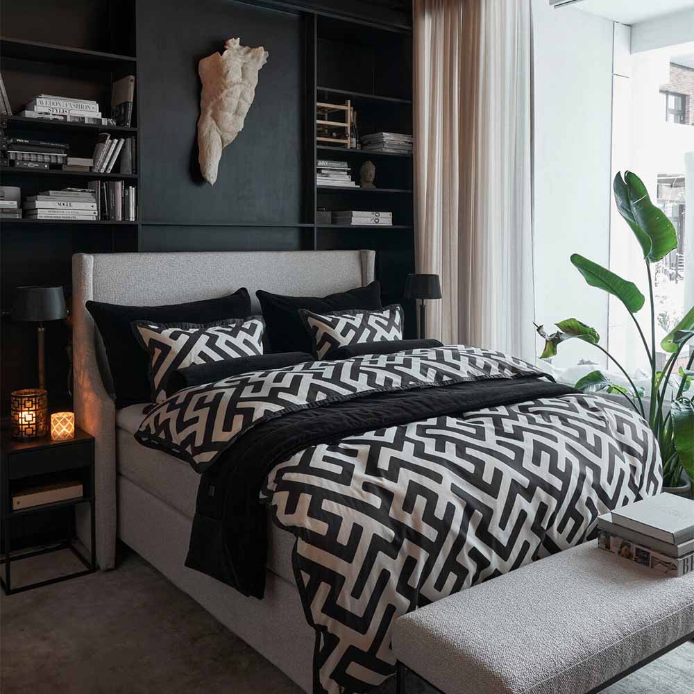Halvor Bakke Anura Påslakansets design, inspirerad av klassiska textilier från Sydafrika, finns i många varianter. I en värld fylld av färger är det monokroma mönstret en uppfriskande kontrast där mönstret verkligen får spela huvudrollen. Den svarta kontrastkanten binder ihop allt och satinens kvalitet är fantastisk - härlig att sova i och gör att den bäddade sängen ser bra ut i sovrummet. En design som utstrålar klass och elegans, signerad Halvor Bakke.