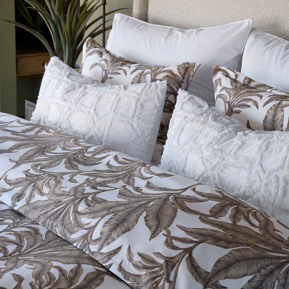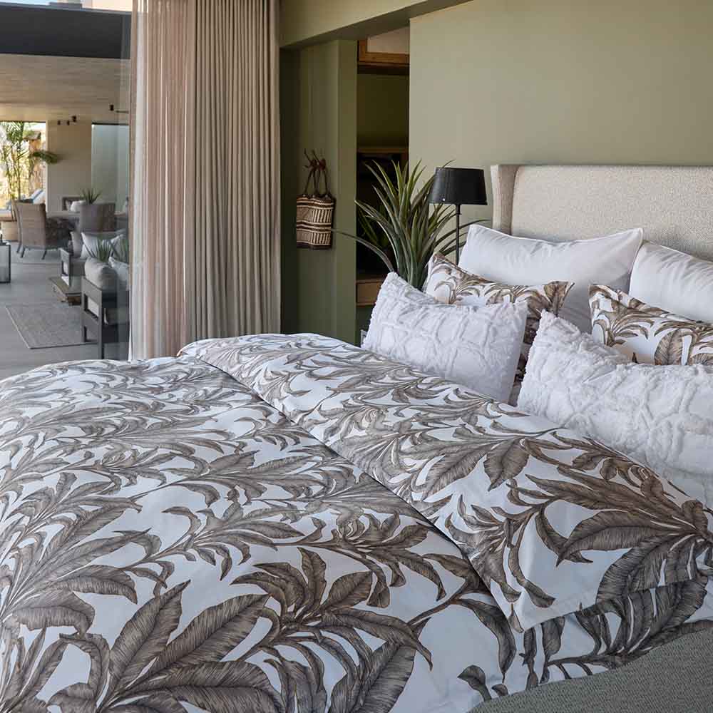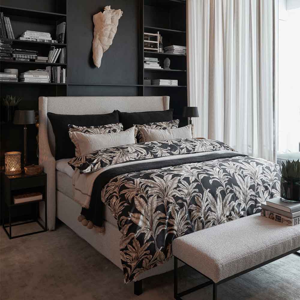 Halvor Bakke Babylonstoren Påslakansets palmemönster ger känslan av varmare breddgrader. Det grafiska bladverket erbjuder en bra mönstrad kontrast mot den mörka bottenfärgen, och kvaliteten från Halvor Bakke är som alltid en exklusiv och vacker satin som framhäver djupet i designen.