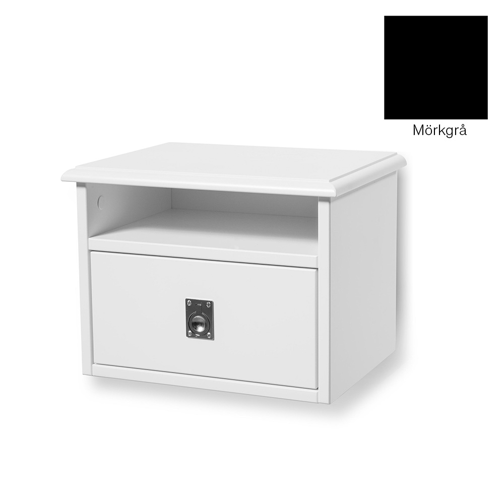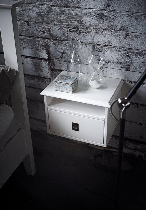 Mavis vägghängda sängbord Smögen är ett både klassiskt och rustikt sängbord. I detta sängbord kan du förvara de saker du vill ha nära sängen i antingen lådan eller den öppna hyllan. Finns i mörkgrått eller vitt utförande.