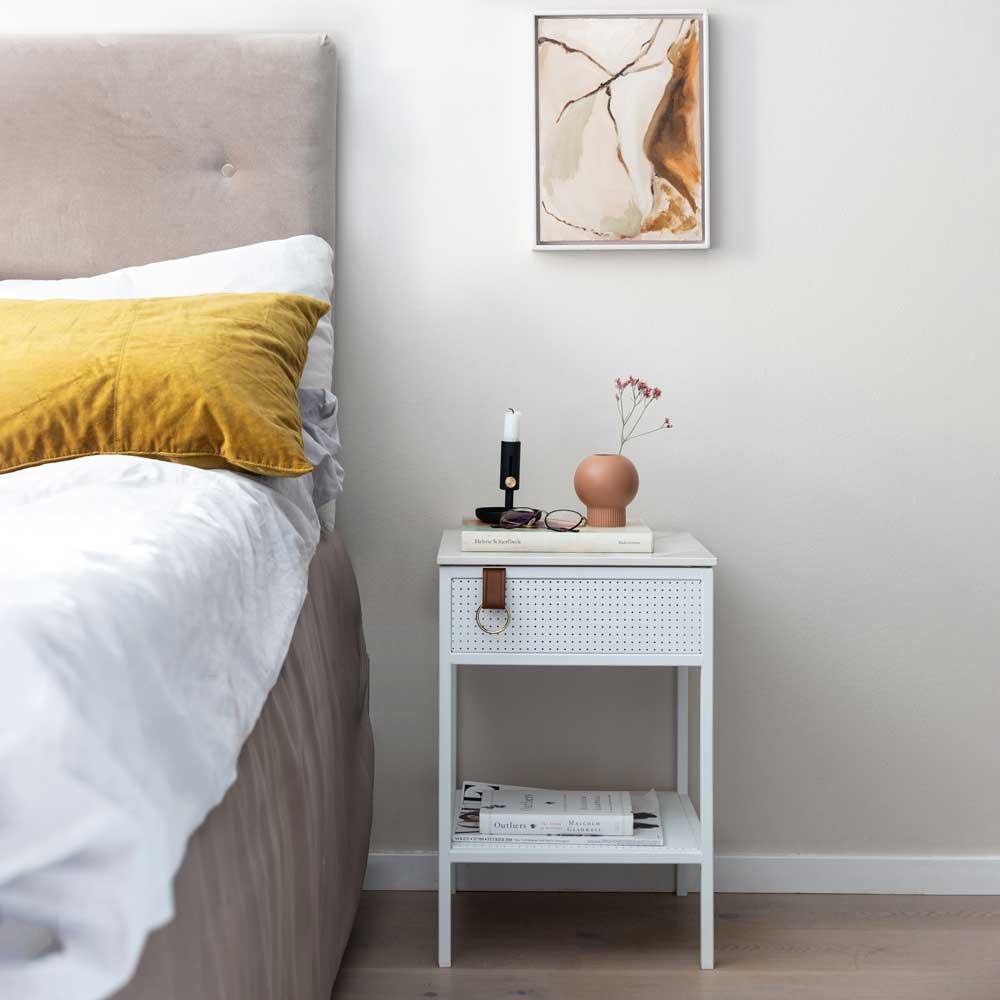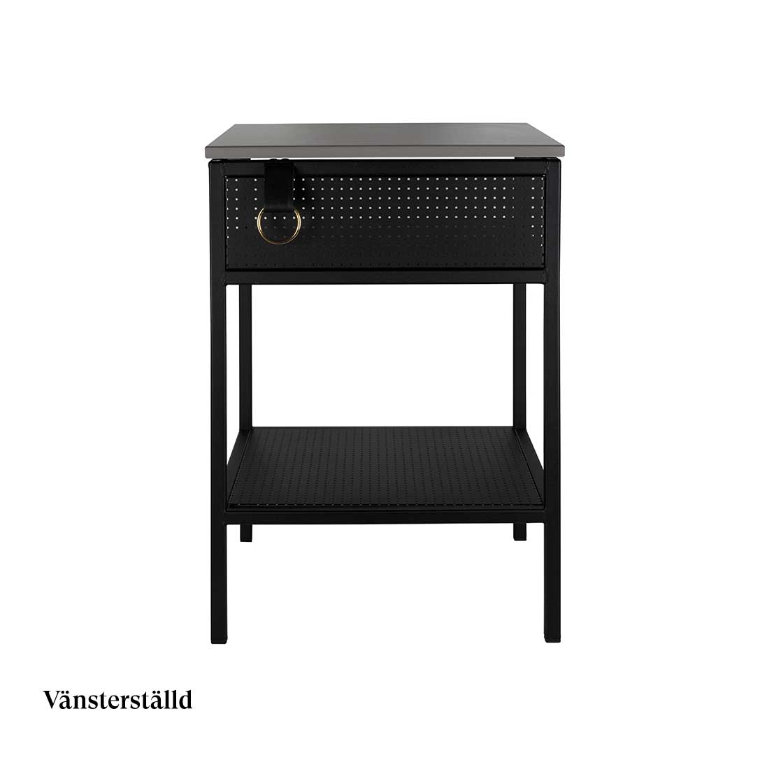 Sängbordet Tracy i stilren och smart design från Maze som passar perfekt bredvid sängen. Bordet är tillverkat i tålig och hållbar pulverlackerad metall. Göm undan böcker och liknande bakom skåpslucka i perforerad plåt som täcker på ett stilfullt sätt. Den exklusiva keramiska bordsskivan från Italien är både reptålig och klarar varma koppar utan att märken bildas. För att bordet ska göra sig som bäst bredvid sängen finns det i både vitt och svart samt höger- och vänsterställt.